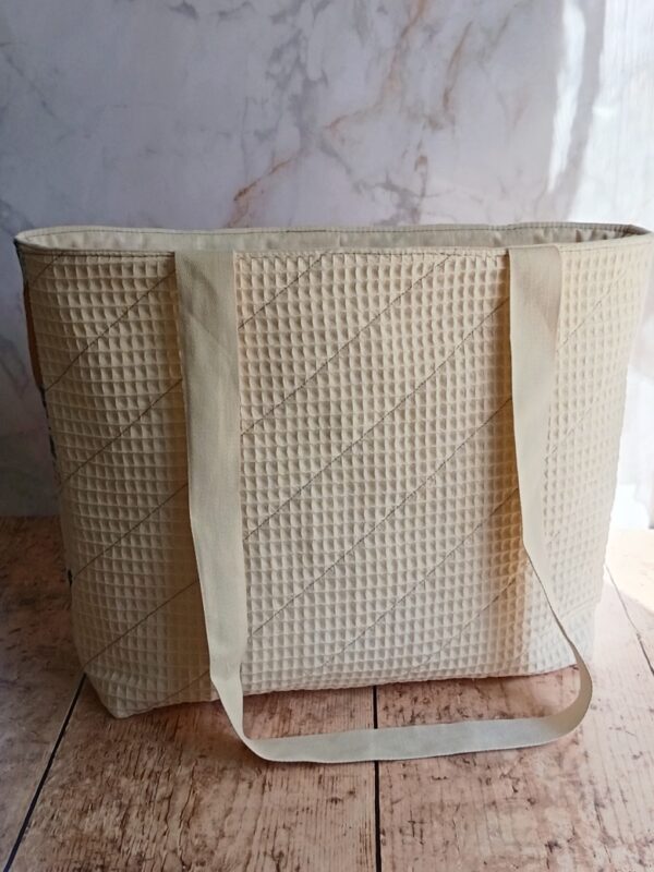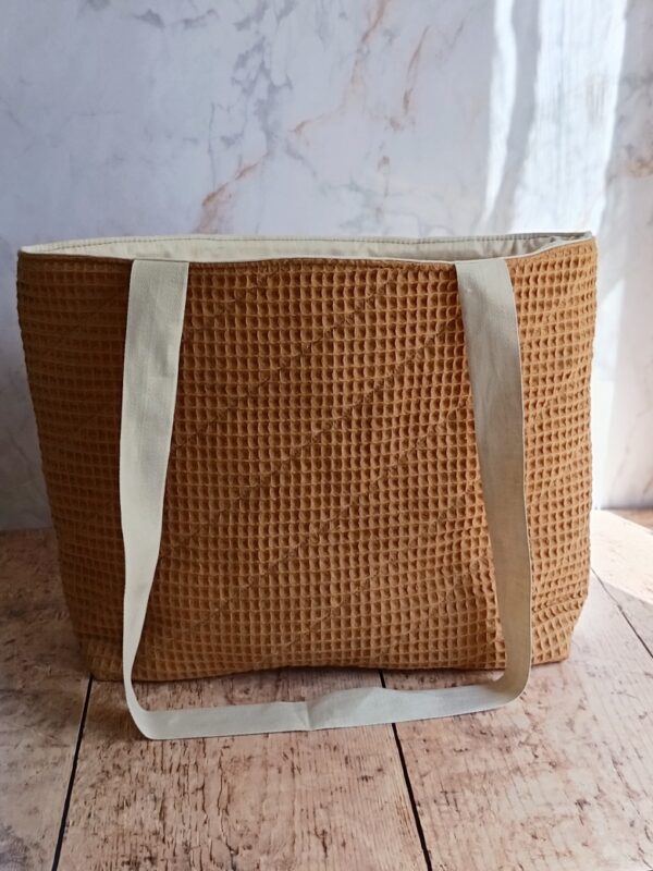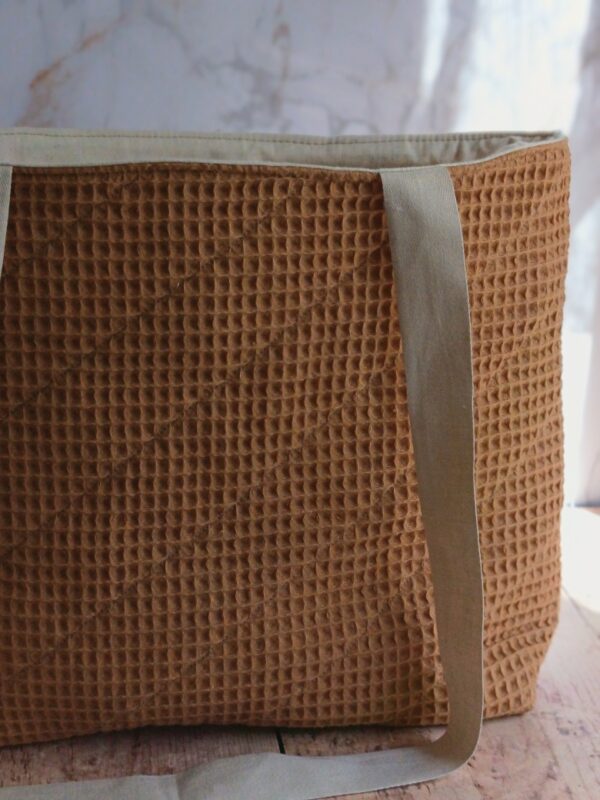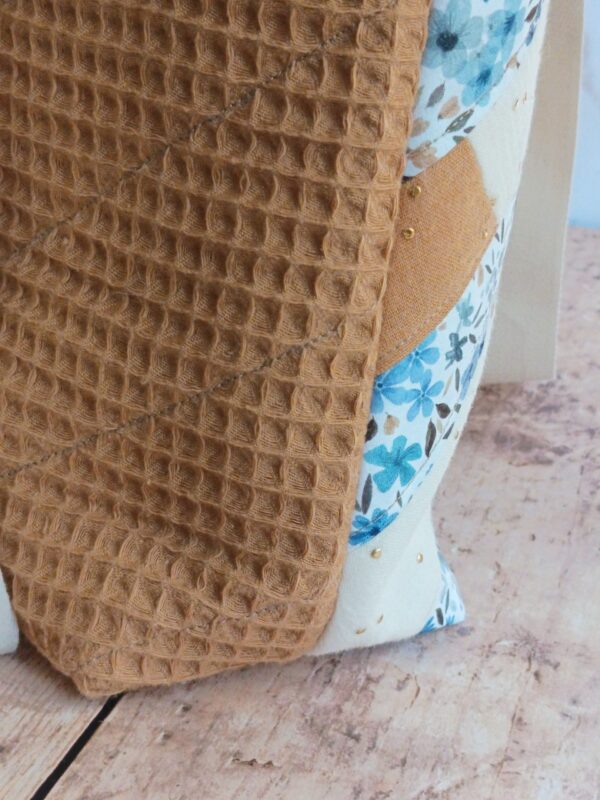Qualité et finitions Réalisé à la main, ce cabas bénéficie de coutures renforcées. Le tissu issu de la collection « Douceur ocre bleuté » offre un coloris sobre et élégant qui s’accorde avec tout. Vous investissez dans un produit qui ne se déformera pas après trois utilisations.